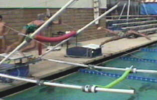 We can still see that the momentum from the height and angle of entry carries the swimmer in Lane 1 ahead of the swimmer in Lane 2, even though Lane 1 was the last to enter the water. |