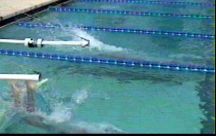 Lane 1 is just entering the water with a very nice angle of entry and a clean single hole. Lane 2 is already completely entered the water and is thrusting forward. |