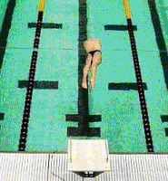 Reach out in front as far as possible with the arms stretched out leading the way. The longer the stretch the more the weight of the body will come forward and will cause your seesaw to tilt at the proper time for the correct angle of entry into the water.